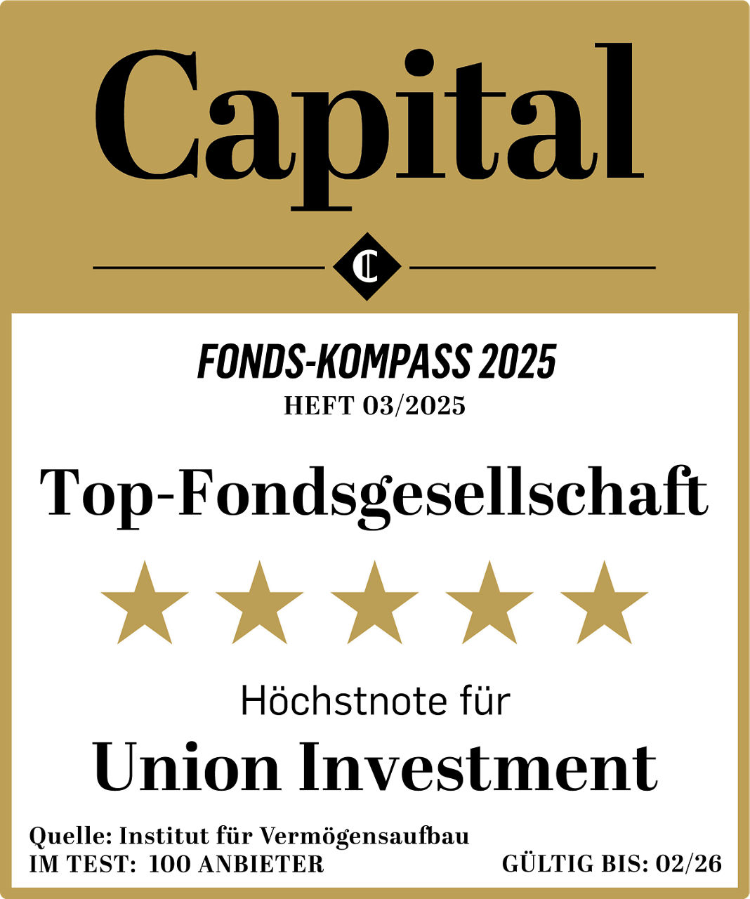 Als einzige Fondsgesellschaft Deutschlands erhielt die Union Investment zum 23. Mal in Folge die Bestnote "5 Sterne" (Stand: Februar 2025).